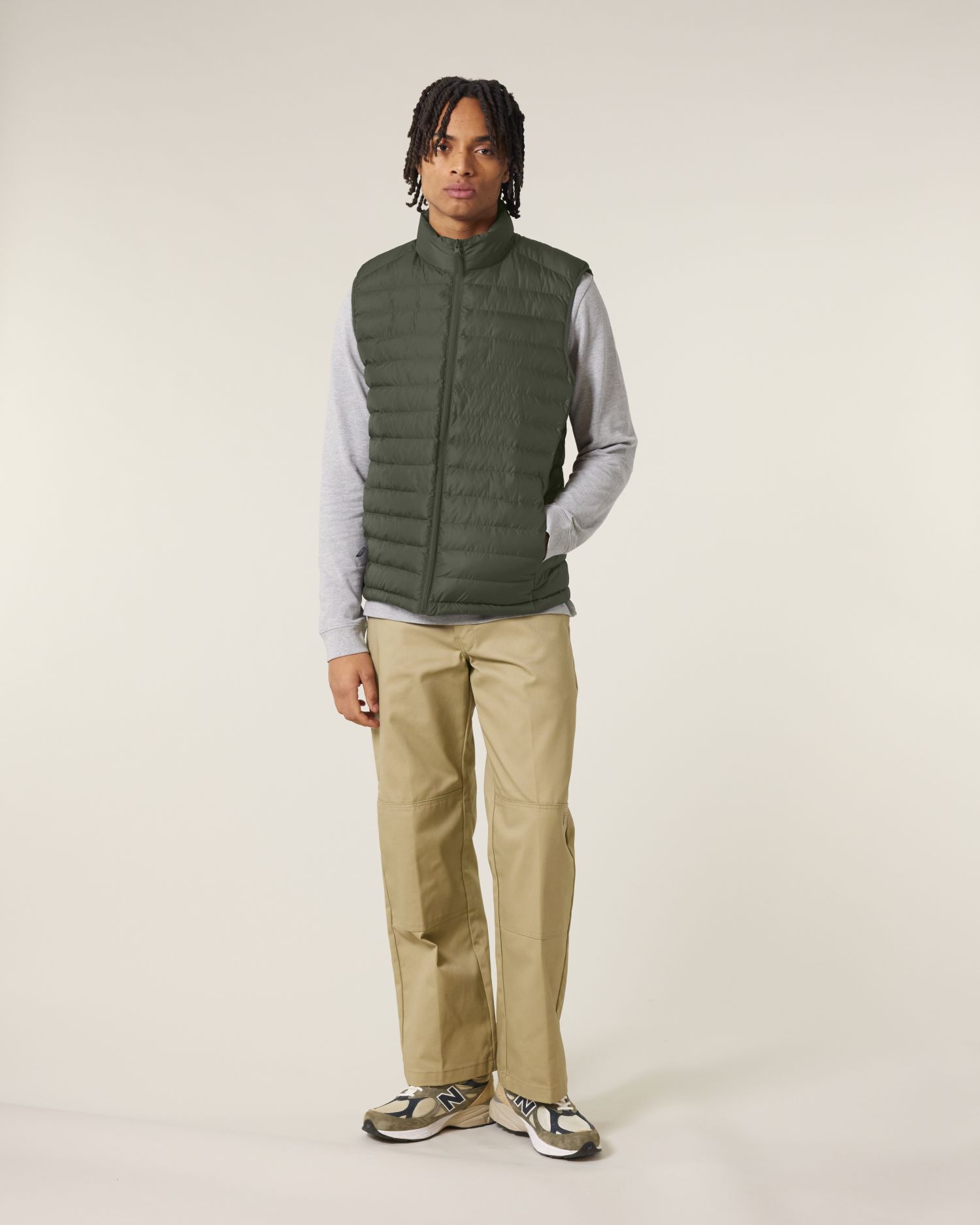 Sleeveless High collar Reverse nylon zip at center front Zipped welt pockets with extra grosgrain puller Elastic tape binding at armhole Fully quilted Side panels for better shape Inside seams with binding finish Bottom hem with adjustable plastic stopper and elastic cord