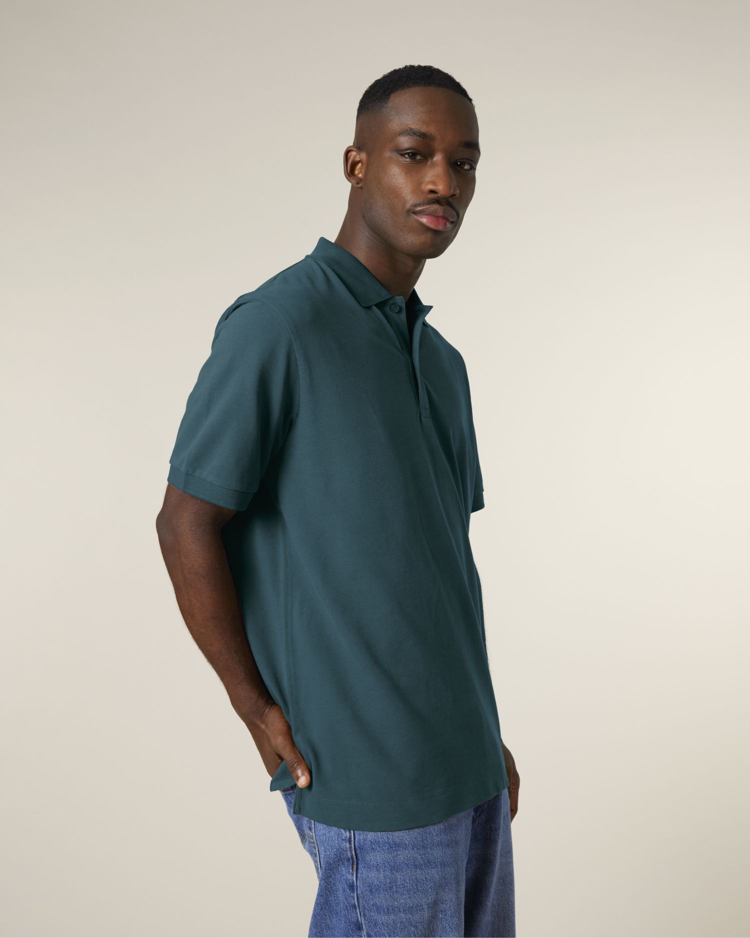 Flat rib-knit collar and sleeve cuffs Heavy single-jersey back neck tape Two-button front placket with buttons in matching colour Set-in sleeves Single-needle topstitching at shoulder seams Side slits with heavy single-jersey facing Narrow twin-needle topstitching at hem
